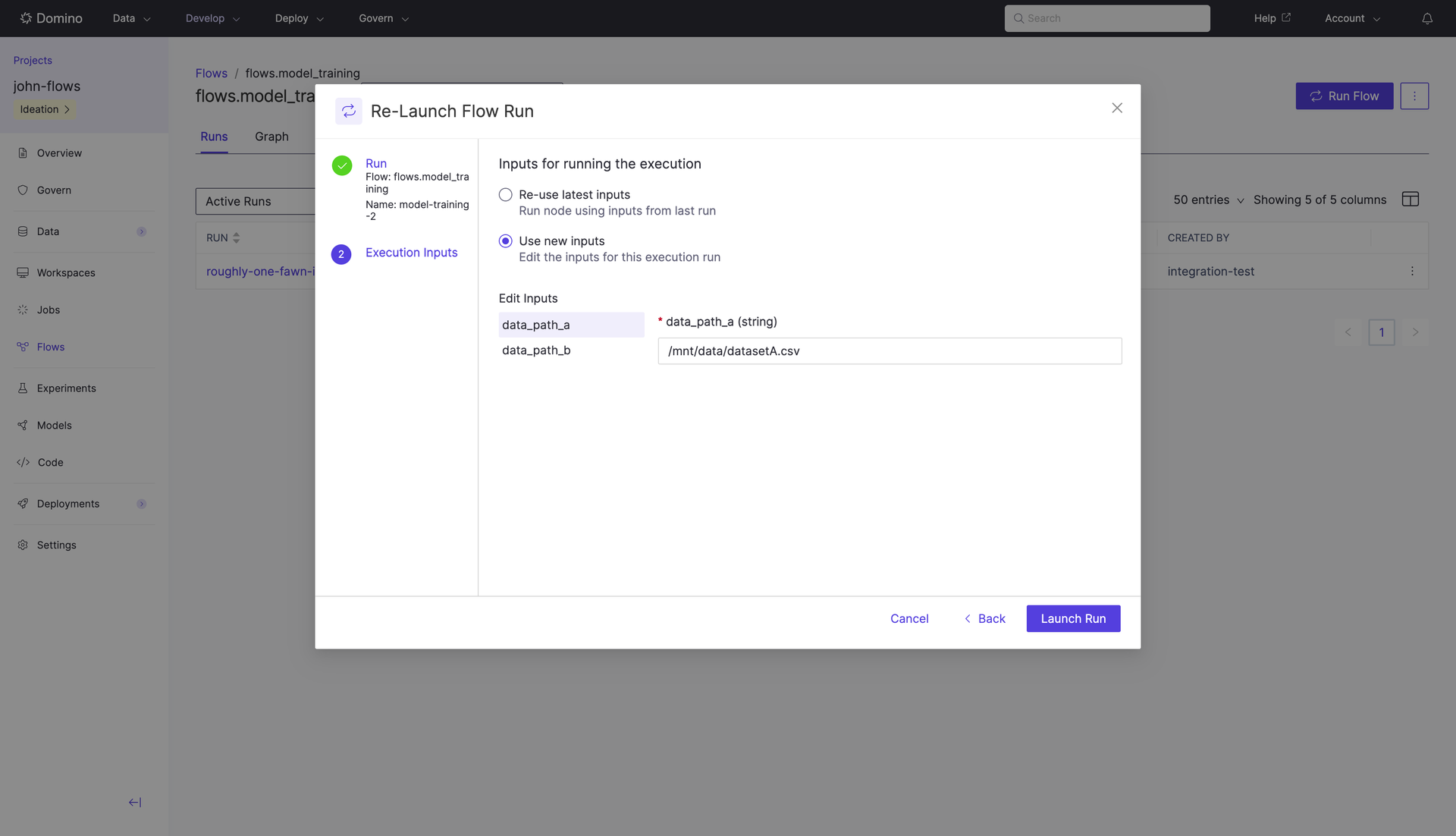 Data scientists often need to retrain models with new data or adjust parameters to improve performance. Domino Flows simplifies this process by allowing seamless re-runs of workflows or specific nodes directly from the Domino UI.