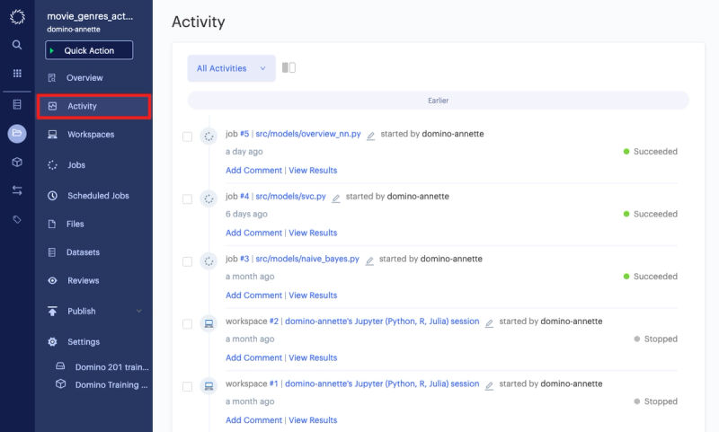 In addition to being able to track project changes over time, data scientists can easily access results for a job or workspace, click on job numbers to view more detail in the Experiment Manager, and easily compare jobs right from the Activity Feed. If a data scientist only wants a particular view, it’s also possible to filter by jobs, workspaces, and comments.