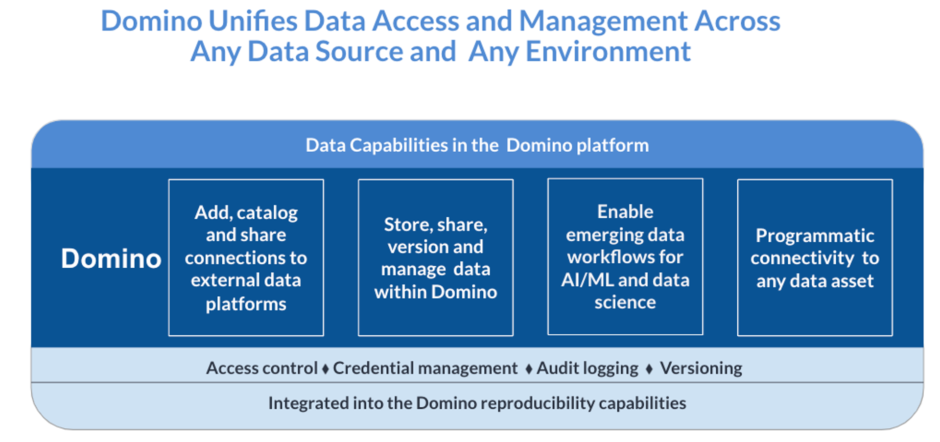 Domino's Fall ’23 release empowers enterprises to build AI solutions faster and more responsibly. It combines the benefits of AI project templates and Generative AI capabilities, using more data from more sources. You get more data with more control thanks to Data Access Audit Logging. Domino continues to help leading enterprises deliver AI solutions on time and on budget. They get AI done without compromising security or responsible practices.