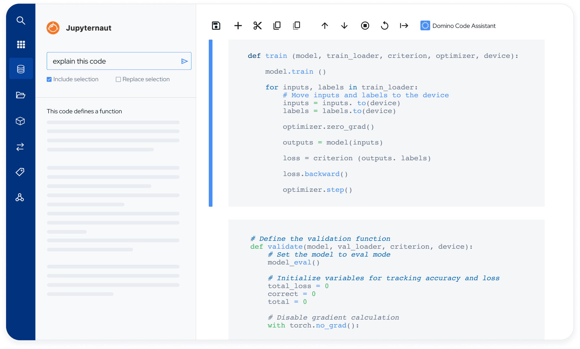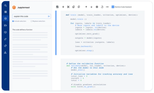 Domino empowers data scientists with Jupyter AI. Select a coder model from the top LLM providers. Get broad support for a wide range of programming languages. Cut time wasted on mundane tasks with automated code and notebook generation. Let the model RTFM and get answers faster than Googling. An unintrusive chat interface lets you control how you interact and get help from the AI. Learn more.