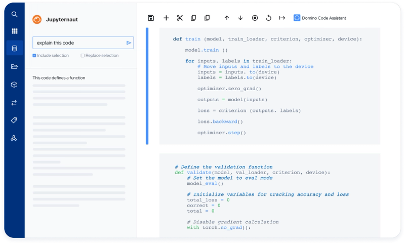 JupyterLab and Jupyter are two of the most popular development environments on Domino. Now, with Jupyter AI on Domino, corporate customers can develop faster and still benefit from Domino's essential strengths. Reproducibility is at the heart of Domino's platform. Domino versions underlying software package environments, project source code, and data snapshots. And that includes code you generate with Jupyter AI. We offer collaboration tools that simplify code reuse with teams across the organization. Domino offers enterprises a choice in tools that help get AI done faster, responsibly, and on budget. As an open, flexible platform, we are excited to give enterprises even more control over their projects with Jupyter AI.
