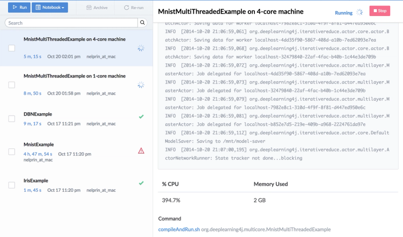 The screenshot above shows several different "Runs" of the dl4j code on Domino, each one executing a different dl4j example. The selected run is the multi-core MNIST example, running on a 4-core machine.