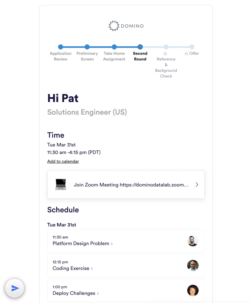 Even before lockdown came into practice across the US, we proactively moved our interview process to 100% remote. Domino now conducts all our interviews over Zoom. Given that this is a major change to how people normally interview, we introduced interview guides which help candidates know who they’re meeting when, how to connect to their Zoom interviews, and gives them a chat box to connect directly with our recruiting team in real time.