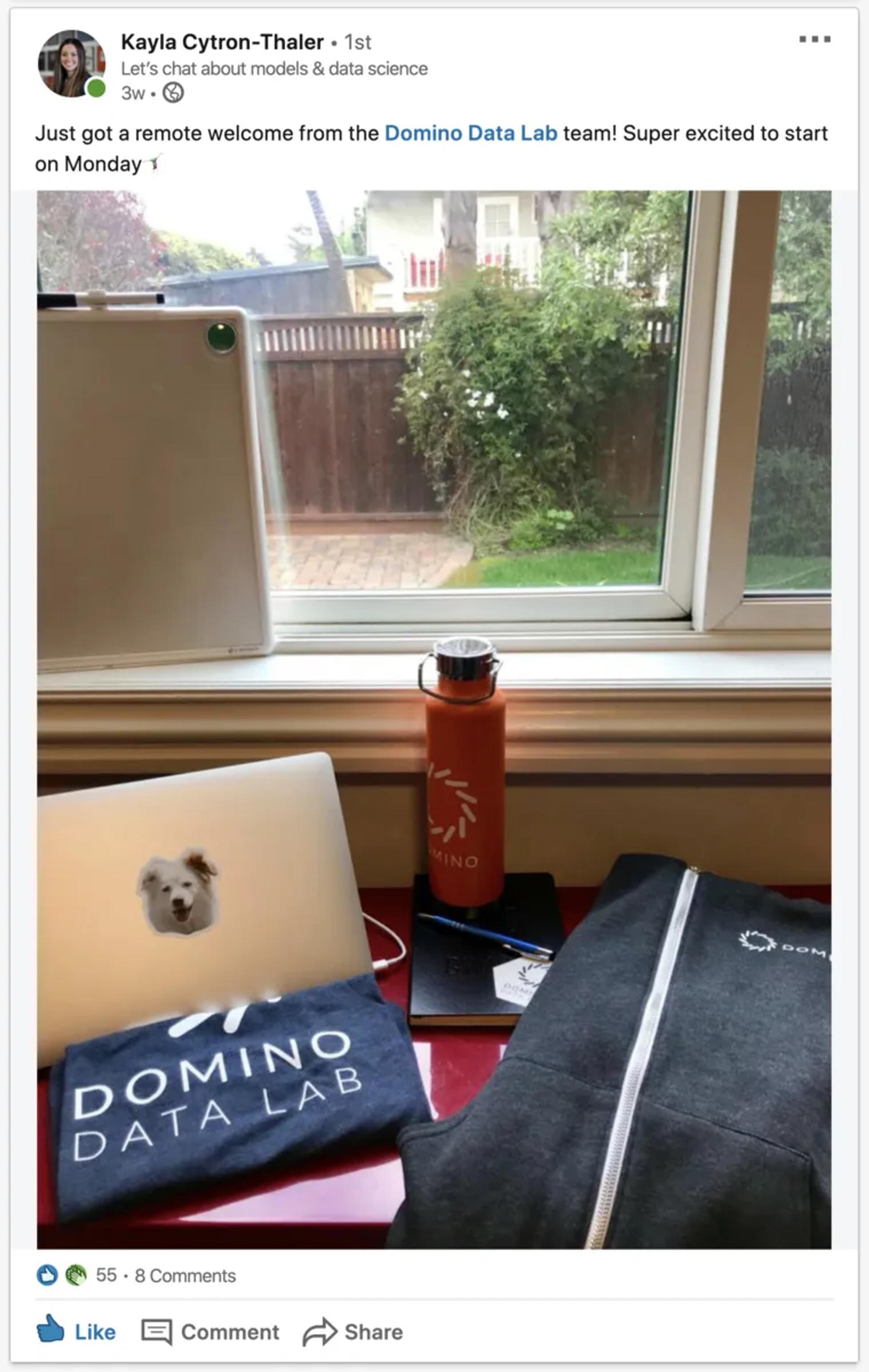 Now that we’re 100% remote, we’ve moved Domino Academy to Zoom. All our new hires get their welcome kit with swag and laptop via FedEx in advance of their start date. New hires join their new hire cohort every other Monday to begin their onboarding and training.