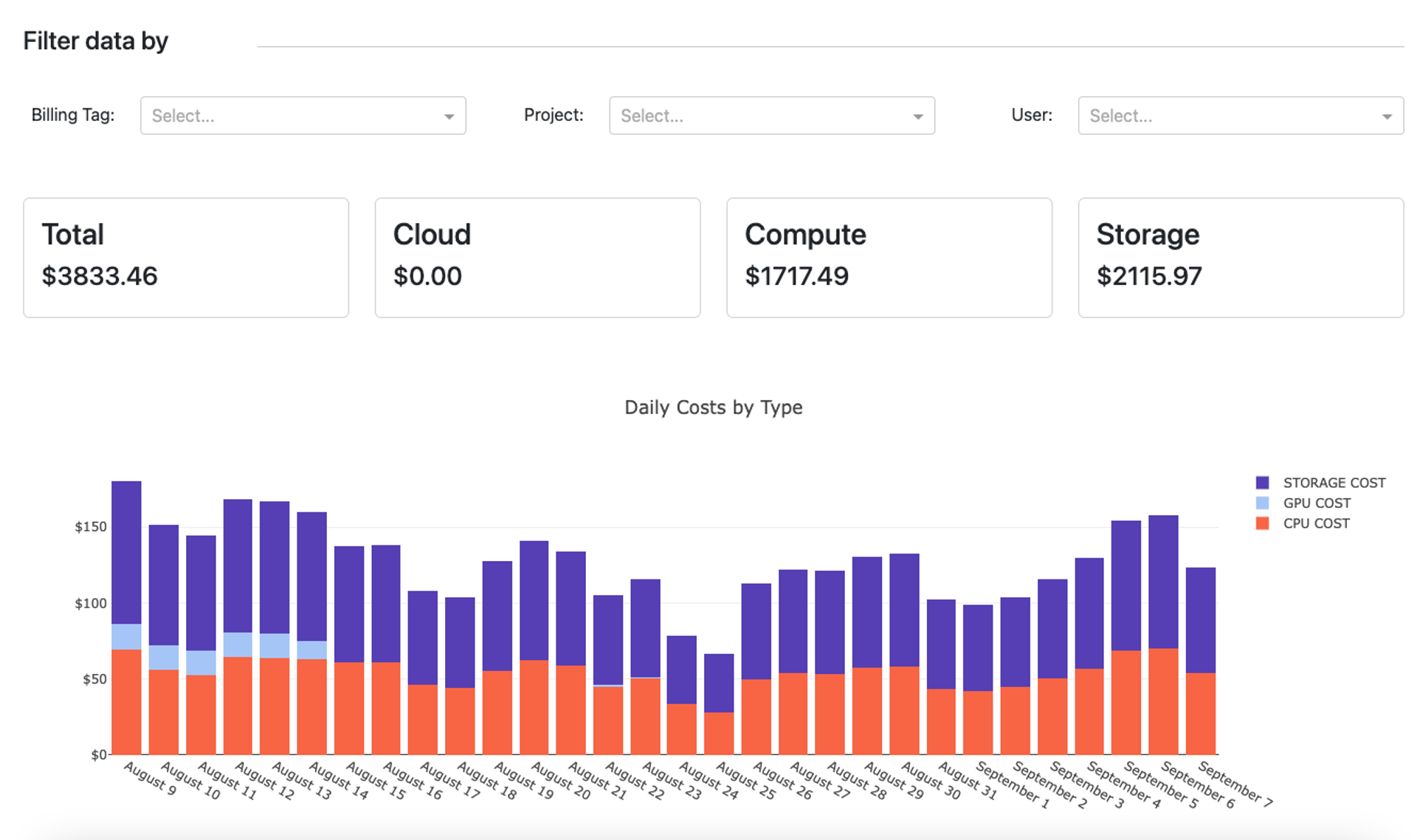 With Domino FinOps, organizations can view reports with granular attribution of compute and storage spending across various dimensions such as users, projects, organizational units, compute clusters, and hardware tiers — across all infrastructures, such as on-premises, hybrid cloud, and multicloud — all in a single pane of glass. Granular cost attribution provides accurate information without any manual tagging of infrastructure assets, and it is a source of invaluable insights into top cost drivers, enabling data-driven decisions in the long term.