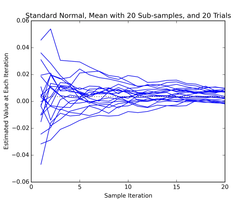 The average of the samples taken internally converges on an appropriate value. The rate of convergence depends on the sample sizes and how well behaved the distribution is. The plot below shows a number of trials predicting the mean of the standard normal distribution generated earlier. The mean value which would typically be used is the last one on each line. Note that there is some variance in this value. There is also a diminishing return as more samples are taken.