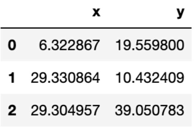 First, we need 1) to decide how many groups we have and 2) assign the initial centroids randomly. In this case, let us consider k=3, and as for the centroids, well, they have to be in the same range as the dataset itself. So, one option is to randomly pick k observations and use their coordinates to initialise the centroids: