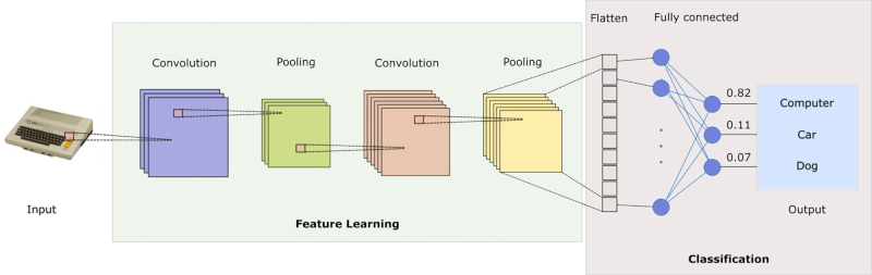 After the relevant features have been extracted, the final layer is flattened so that all features can be fed to the second component of the CNN - a fully connected feedforward network. This part of the network is responsible for performing the actual classification, and its number of outputs corresponds to the number of classes in the dataset. The outputs are typically evaluated after a softmax function, which is used to squash the raw scores into normalised values that add up to one. This is a standard configuration for a classical feedforward network tasked with classification problems.