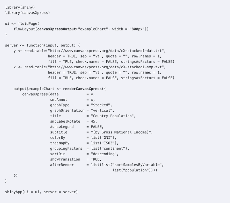 Here is a one-page shiny app that shows this chart – a canvasXpressOutput in the ui call is paired with a renderCanvasXpress reactive in the server call that contains the exact same canvasXpress function call we created above: