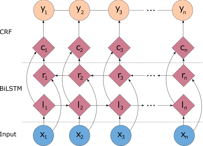 One problem with the linear chain CRFs (Figure 1) is that they are capable of capturing the dependencies between labels in the forward direction only. If the model encounters an entity like "Johns Hopkins University" it will likely tag the Hopkins token as a name, because the model is "blind" to the university token that appears downstream. One way to resolve this challenge is to introduce a bidirectional LSTM (BiLSTM) network between the inputs (words) and the CRF. The bidirectional LSTM consists of two LSTM networks - one takes the input in a forward direction, and a second one taking the input in a backward direction. Combining the outputs of the two networks yields a context that provides information on samples surrounding each individual token. The output of the BiLSTM is then fed to a linear chain CRF, which can generate predictions using this improved context. This combination of CRF and BiLSTM is often referred to as a BiLSTM-CRF model (Lample et al 2016), and its architecture is shown in Figure 2.
