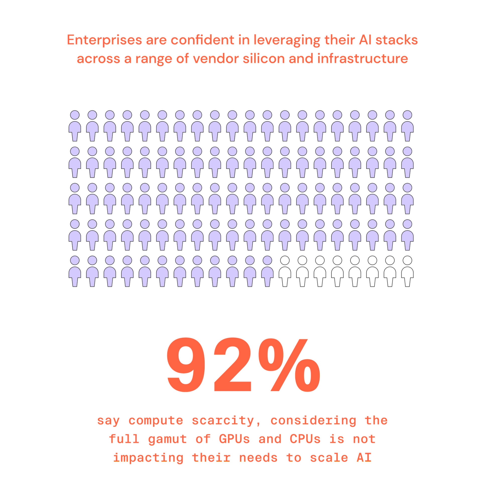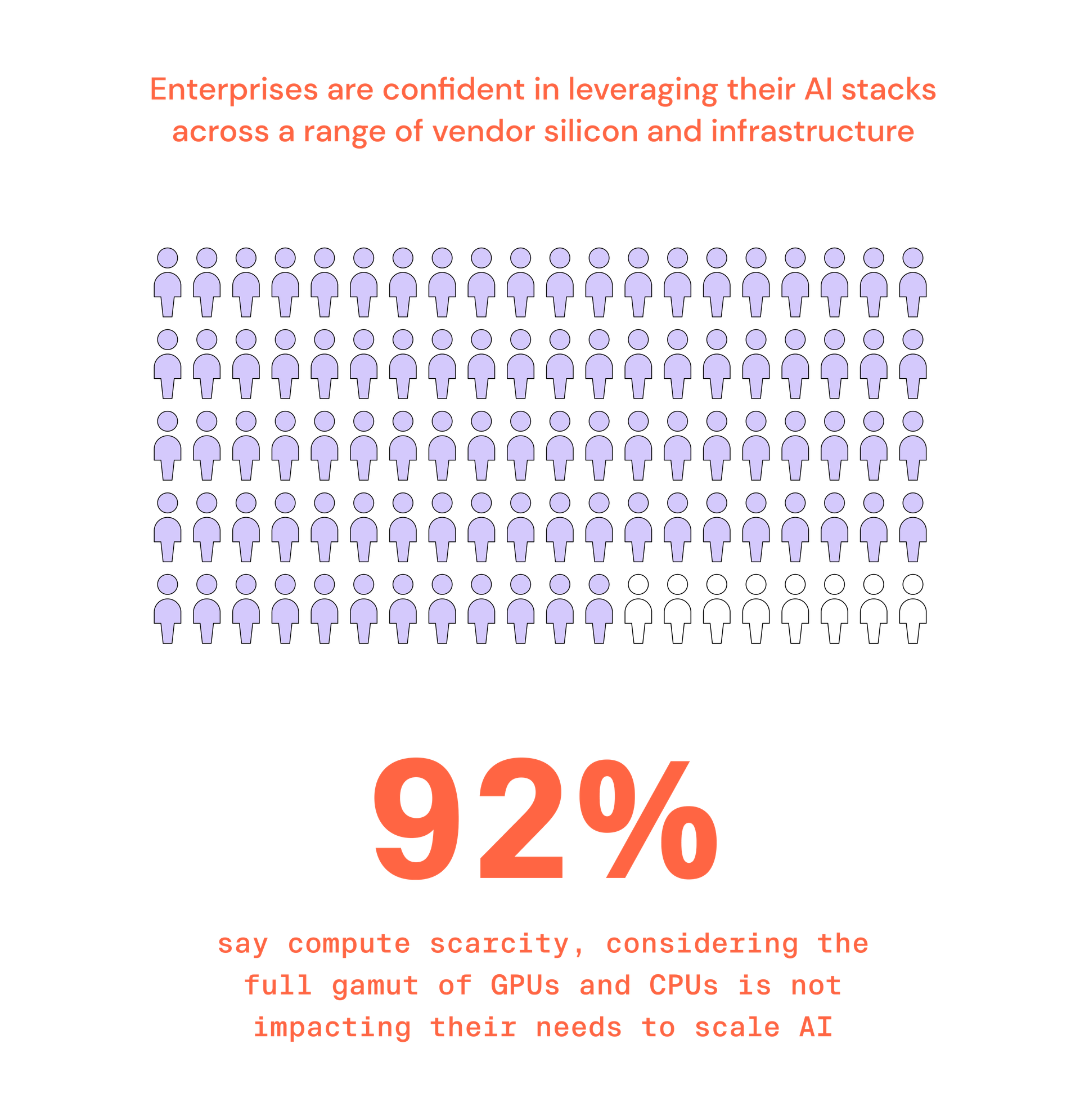 Securing access to today’s most advanced GPUs may seem like trying to book a table at the trendiest restaurant in town — high demand, limited supply, and fierce competition. However, our survey shows that, at least today, not many companies are hindered by compute scarcity and most are confident in leveraging their AI stacks across various vendor silicon and infrastructure. Despite the scarcity of some top-of-the-line GPUs, 9 out of 10 companies (92%) say compute scarcity, considering the full gamut of GPUs and CPUs, is not impacting their needs to scale AI.