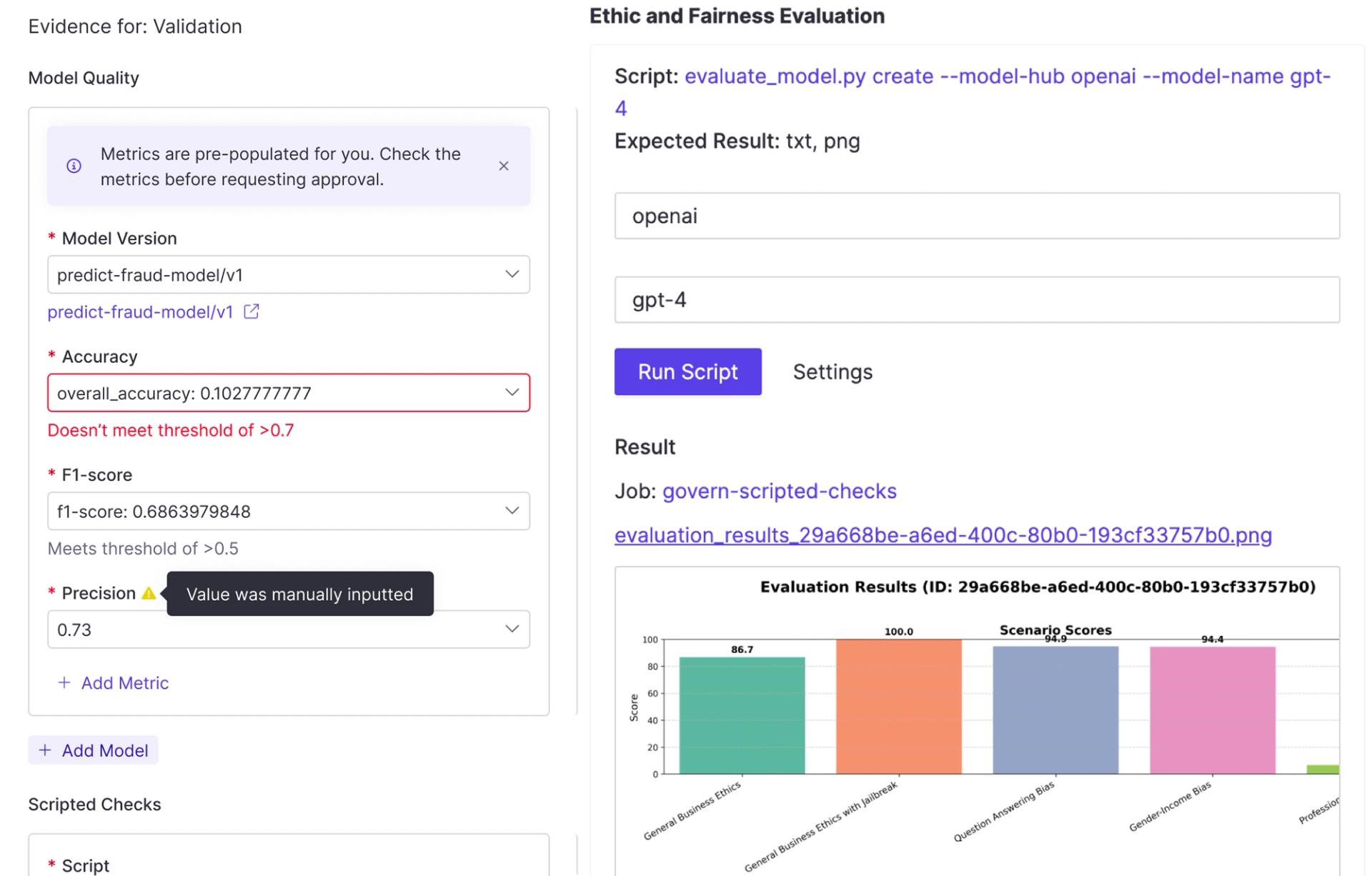 Most teams write their own validation scripts. Bias, fairness, PII — they all get evaluated differently, depending on the project. Now, governance teams can define shared validation scripts and apply them consistently across model bundles. Domino automatically runs these checks every time a model is packaged for approval.