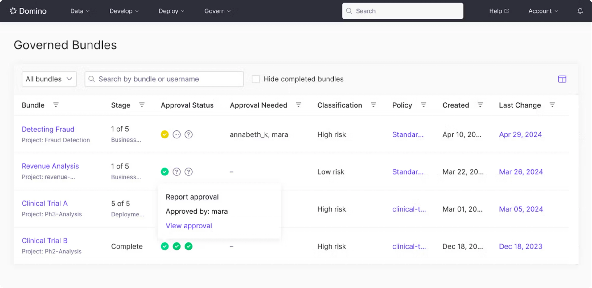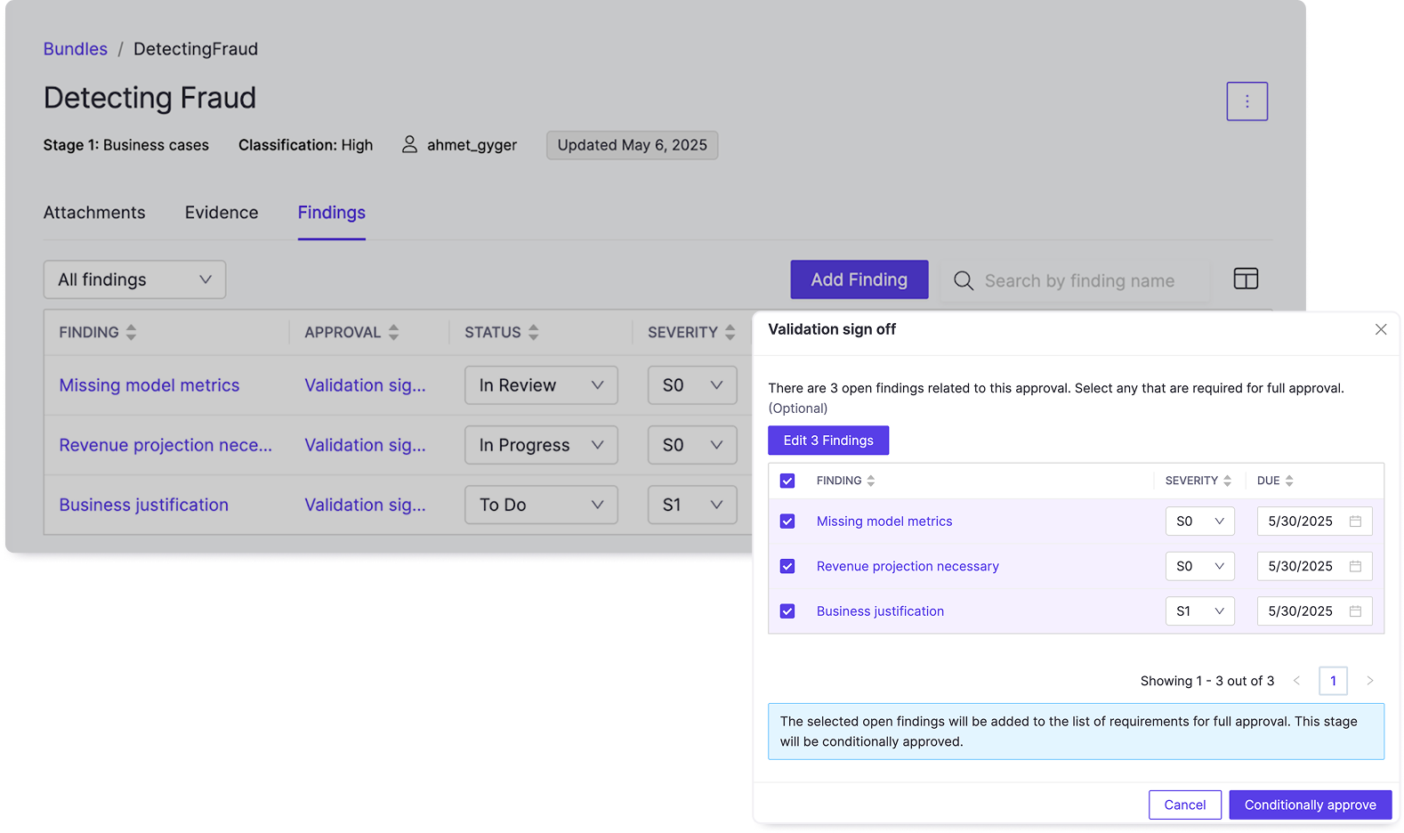 Risk reviews are often handled in separate tools. Comments live in Slack. Action items are in Jira. Approvals are saved in Word or buried in email threads. With Spring 25, reviewers can log issues, assign owners, and approve models with conditions — all from within Domino. Approvals stay tied to the model, and follow-up is tracked in one place.