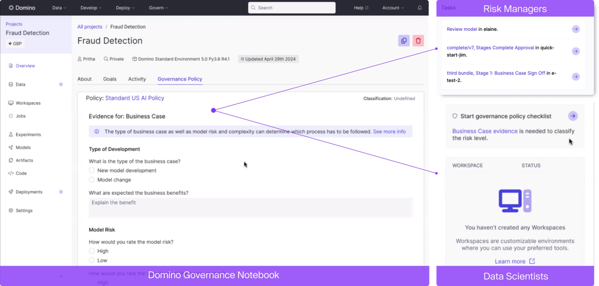 Domino is the only platform that brings policies, model registry, and documentation together in one system. That combination makes it possible to govern AI at scale — without slowing down the people doing the work. Governance isn’t just about compliance. It’s how you scale with clarity and trust. Now you can.