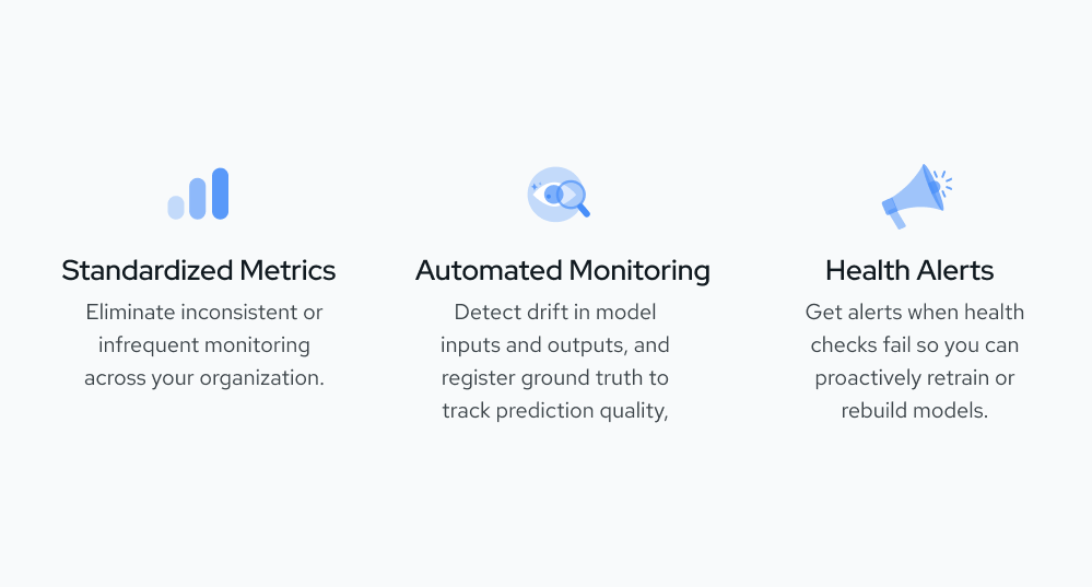 Domino Model Monitor creates a “single pane of glass” to monitor the performance of all models across your entire organization. You can focus on value-added data science projects and receive alerts when production models degrade. Quickly analyze data drift and model quality using an easy-to-understand dashboard and detailed health statistics so you can initiate proactive actions.