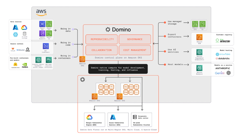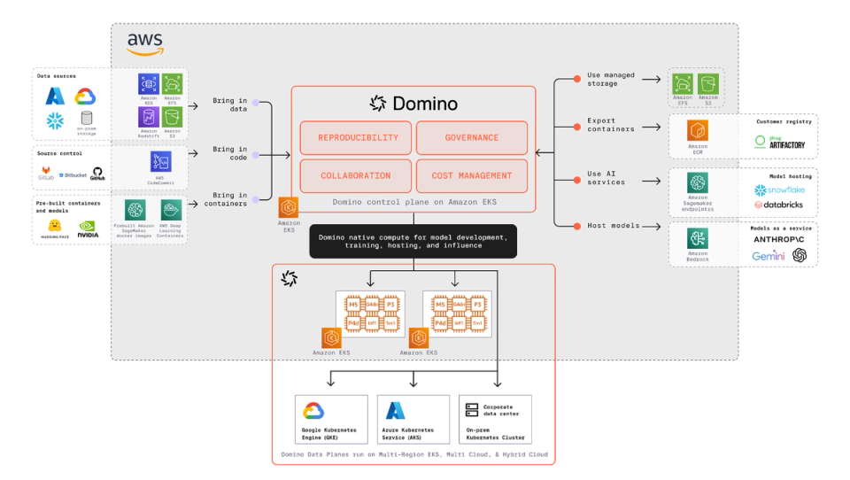 Alternatively, deploy Domino in a dedicated VPC in the AWS region of your choice, including GovCloud. Domino's Kubernetes-ready platform runs on Amazon EKS, providing field-tested deployment patterns for ease of management.