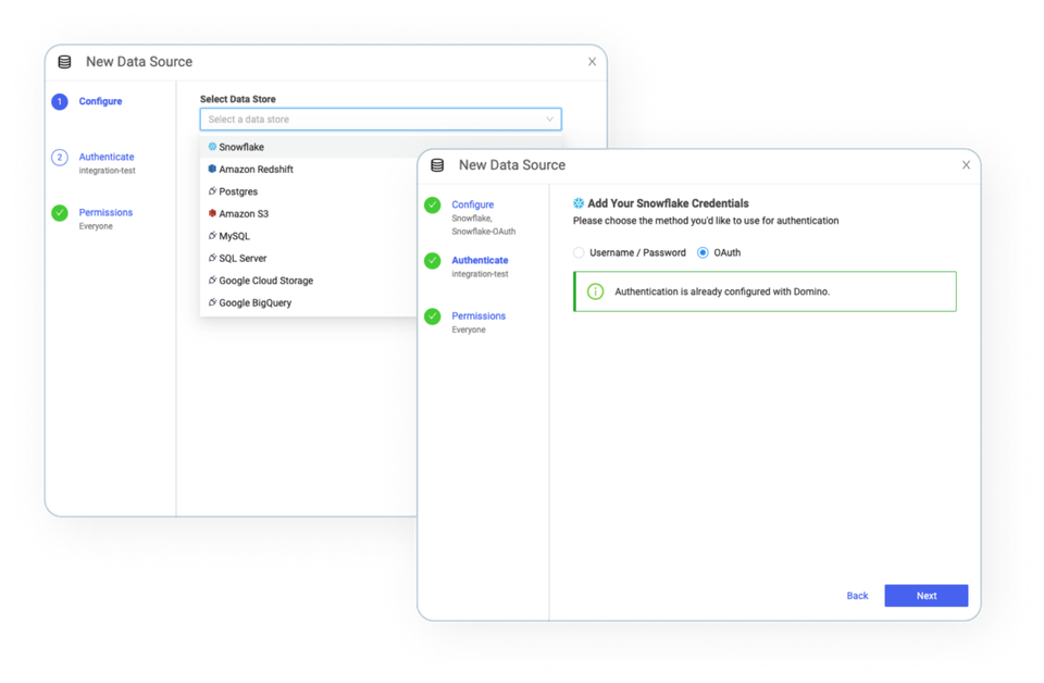 Domino natively integrates with Snowflake - with credentials or OAuth. With just a few clicks, data science teams have immediate access to data residing in Snowflake - without having to orchestrate the movement of data through manual workarounds.