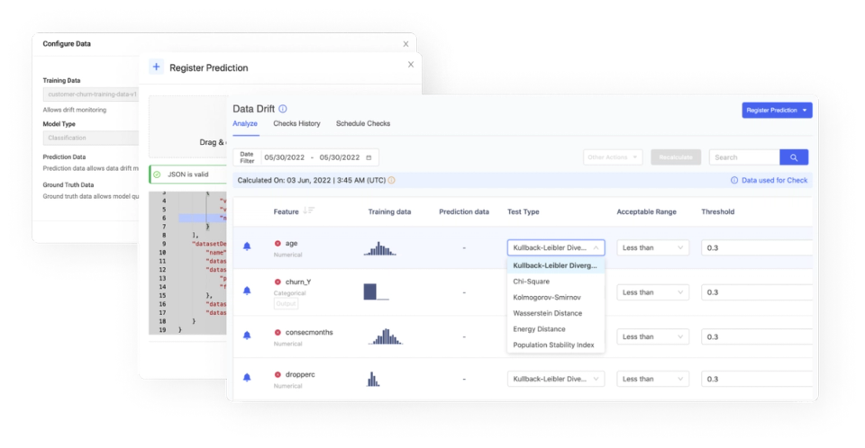 Configure drift tests and thresholds on a per-feature basis, with automated user notifications - all in Domino’s simple interface. Automatically identify when new production data is available, and update data drift and model calculations.