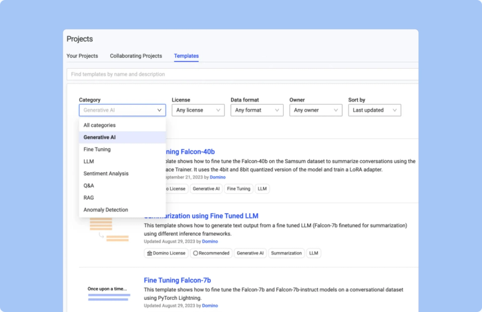 Jumpstart AI development with pre-packaged project templates for developing predictive models, natural language, computer vision, and generative AI applications. Enterprises can also create and share standardized projects securely across the organization.