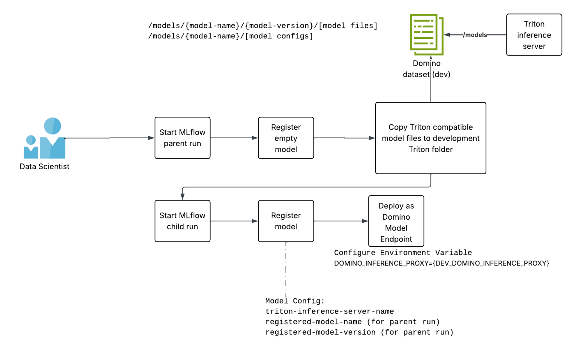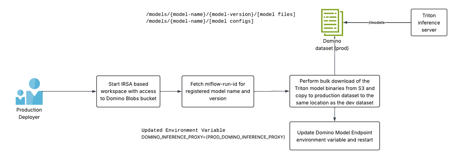 Once satisfied, the model developer asks the Domino user in the designated production deployer to deploy this model. This step requires the prod deployer to create the same folder structure in the production Triton inference server (a separate Domino dataset to which the model developers do not have access). The steps the production deployer will follow are similar to the ones mentioned in the previous article, where LLMs were deployed to Domino endpoints: