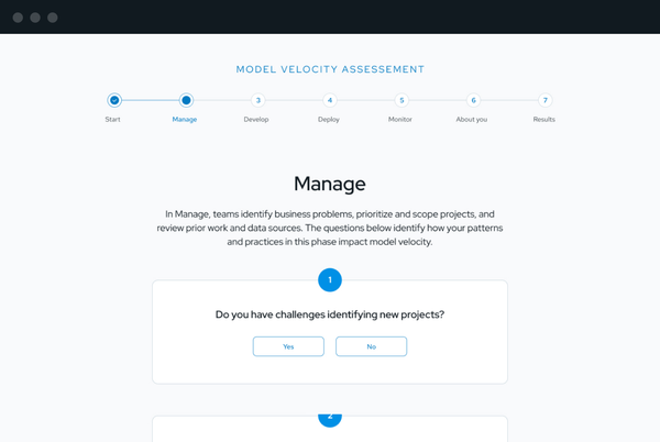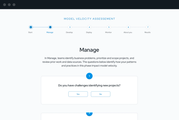Answer a series of yes or no questions intended to examine where risks and opportunities are within the four stages of the data science lifecycle (Manage, Develop, Deploy, Monitor). After completion, you’ll immediately receive a Model Velocity Assessment with areas of improvement and actionable recommendations.