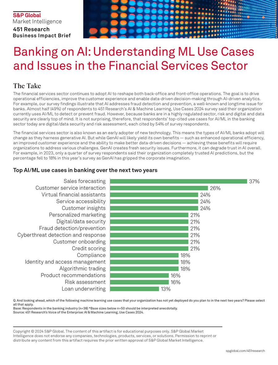 According to 451 Research, part of S&P Global Market Intelligence, AI/ML uses cases survey findings, “It is not surprising, therefore, that respondents’ top-cited use cases for AI/ML in the banking sector today are digital/data security and risk assessment, each cited by 54% of survey respondents.”