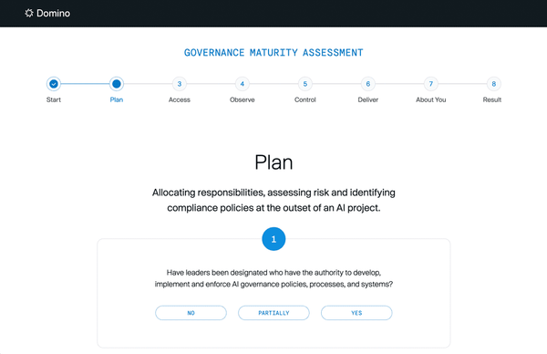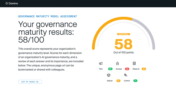 The Domino Governance Maturity Assessment is a tool for evaluating the AI governance maturity of your organization based on its people, policies and processes and platform capabilities.