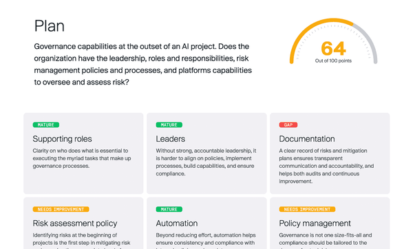 The tool provides an overarching maturity score and granular information about the gaps in your organization's governance capabilities across each stage of the AI lifecycle.